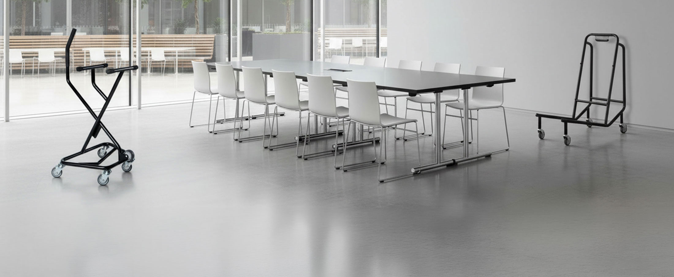 Echte Allrounder-Talente: Die ErgoSus Transportwagen sorgen für Entlastung und effiziente Arbeitsabläufe beim Transport und der Lagerung von Tischen und Stühlen.