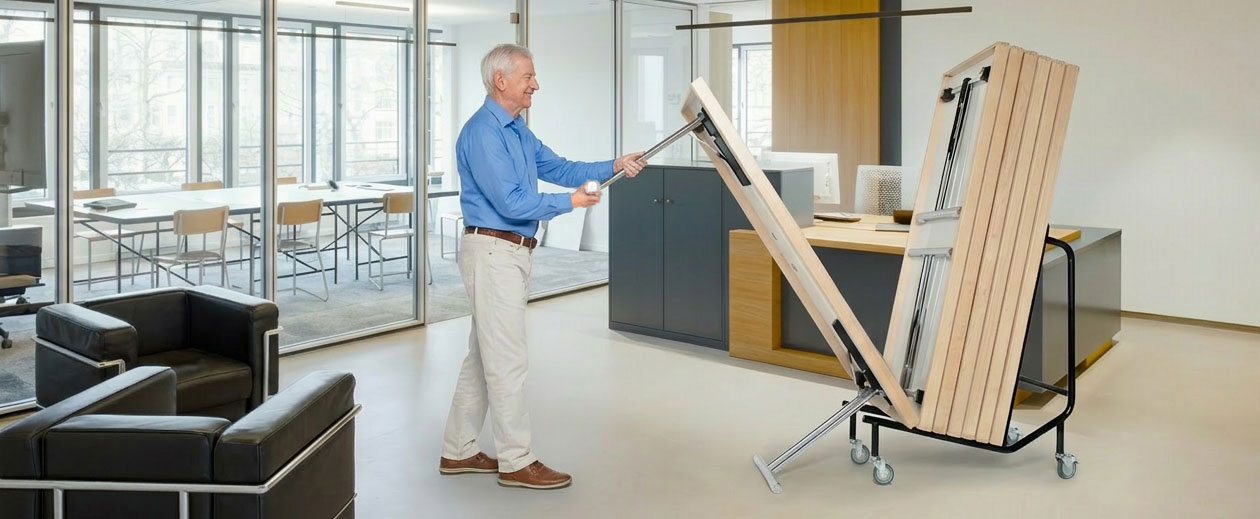 Unsere Transportwagen wurden nicht nur ergonomisch analysiert, sondern auch konstruktiv optimiert. In die Entwicklung flossen jahrelange Erfahrungen aus Gemeindehallen, Schulen, Kulturzentren, Eventlocations und Unternehmen ein.